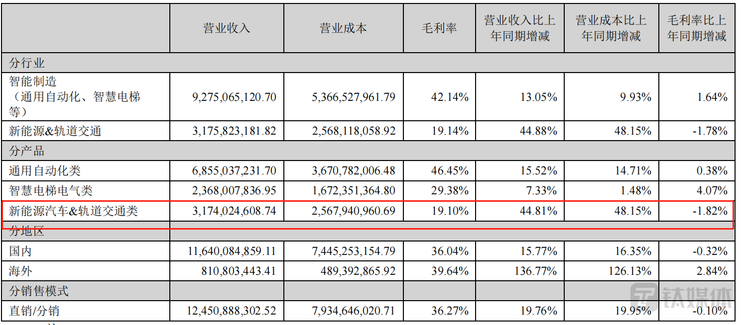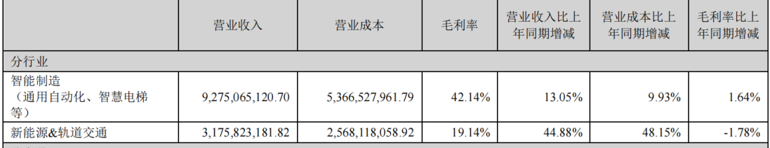 今年上半年,公司营业收入为124.51亿元,同比增长19.76%,其中主要来自于通用自动化和新能源汽车两大相关业务。财报显示,智能制造(通用自动化、智慧电梯等)贡献营收为92.75亿元,同比增长13.05%;新能源和轨道交通贡献营收为31.75亿元,同比增长44.88%。为何今年上半年公司营收增长强劲?