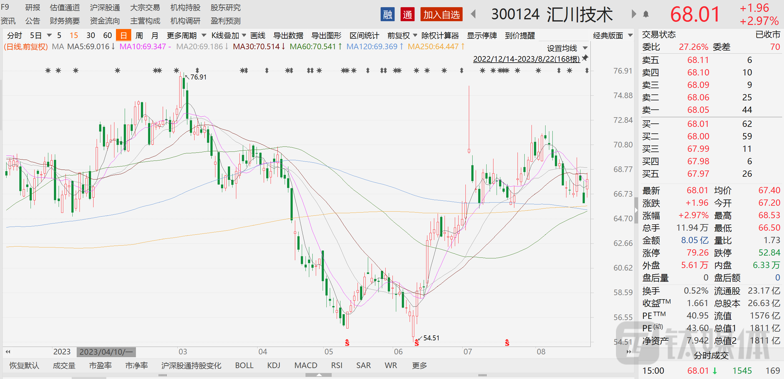 随着半年报业绩利好发酵,次日公司股票高开并震荡走高,盘中一度上涨至3.75%。截至8月22日收盘,股价收报68.01元,上涨2.97%,总市值1811亿元。