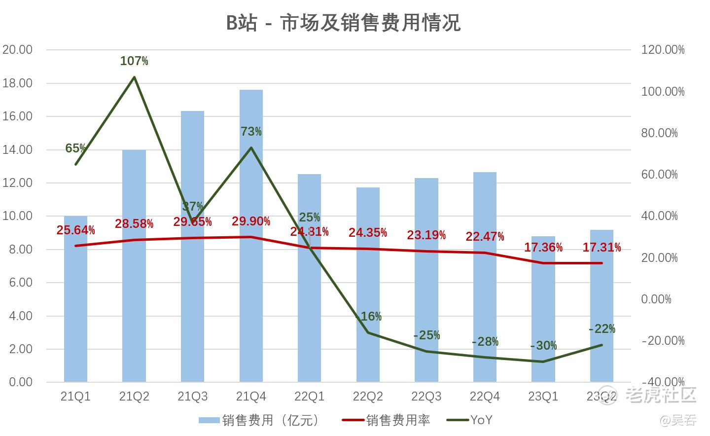 B站的大幅减亏一方面源于毛利的增长,另一方和降本增效亦息息相关。Q2,B站总运营费用为25亿元,同比下降14%,其中营销费用同比下降22%,管理费用同比下降14%。尤其值得一提的是营销费用已经连续五个季度实现同比下降。营销费用率17.31%,与Q1的17.36%持平,相比22年各季度22%+的水平大幅下降。