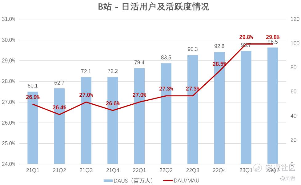 根据财报,第二季度,B站DAU同比增长15%,DAU/MAU达到29.8%,仅次于2019年Q2的30.2%,创近年新高,日均用户时长94分钟,也是二季度历史最高水平。在营销费用连续五季度显著同比下滑的背景下,用户活跃度不降反升,充分展现出了B站强大的自我造血能力及用户粘性。