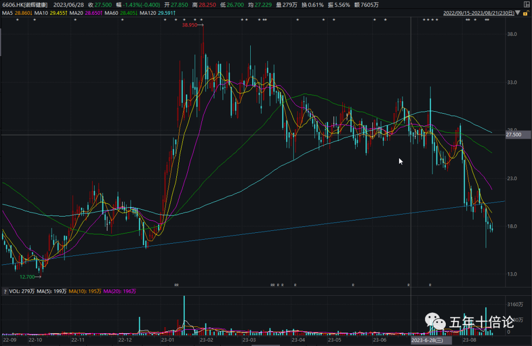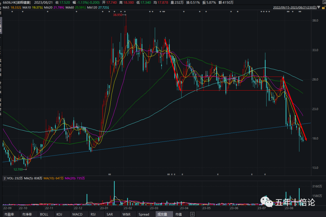 关于诺辉健康,本作者一共发布了3篇文章,第一篇是6月28日的《诺辉健康走势分析:中国癌症早筛第一股,营收爆发式增长,长期看好》,第二篇是7月14日的《诺辉健康23年上半年业绩预告解析:业绩暴增,毛利直逼茅台,股价却暴跌!》,第三篇是8月17日的《盘中暴跌20%!诺辉健康“财务造假事件”分析》,自第一篇文章发布以来,一直是趋势性下跌的态势,累计下跌37%。