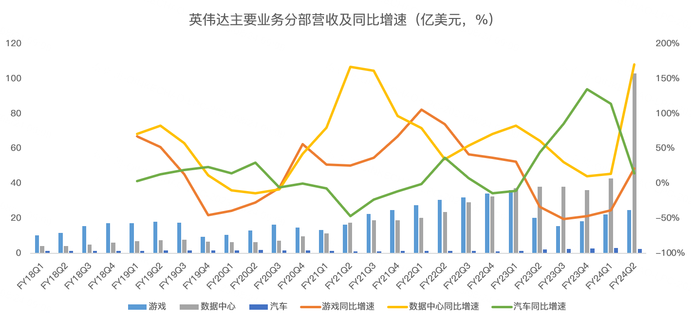 分业务来看,数据中心二季度营收103.2亿美元,同比暴增170.9%,远超分析师预期的78.6亿;游戏业务营收24.86亿美元,同比增长21.9%,略超分析师预期的23.78亿;汽车芯片二季度营收2.53亿美元,同比增长15%,低于分析师预期的3.11亿;专业可视化和其他业务营收规模较小,且成长性较差,在此不过多谈论: