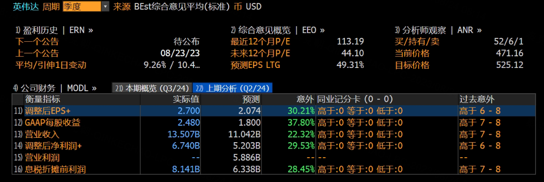 二季度,英伟达营收135亿美元,分析师预期110亿美元;调整后净利润67亿美元,分析师预期52亿: