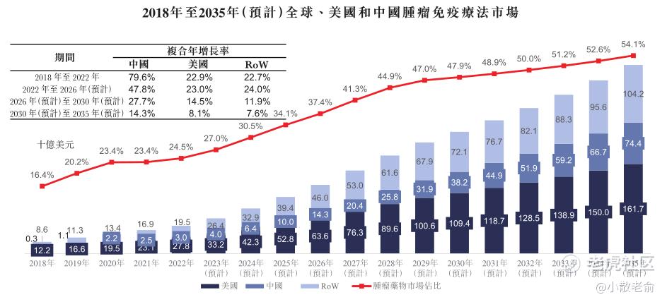 根据弗若斯特沙利文的资料,2022年全球肿瘤免疫疗法的市场规模达到502亿美元,受癌症新发病例数量增加、病患存活率提高及治疗周期延长,以及免疫疗法发展的推动,预计在可预见未来将继续保持快速增长。2035年,全球肿瘤免疫疗法市场预计将达到3,404亿美元,占全球肿瘤市场总额的54%以上。得益于新药的不断推出和患者负担能力的提高,中国肿瘤免疫疗法市场不断增长,预期增长速度将超过全球和美国市场。
