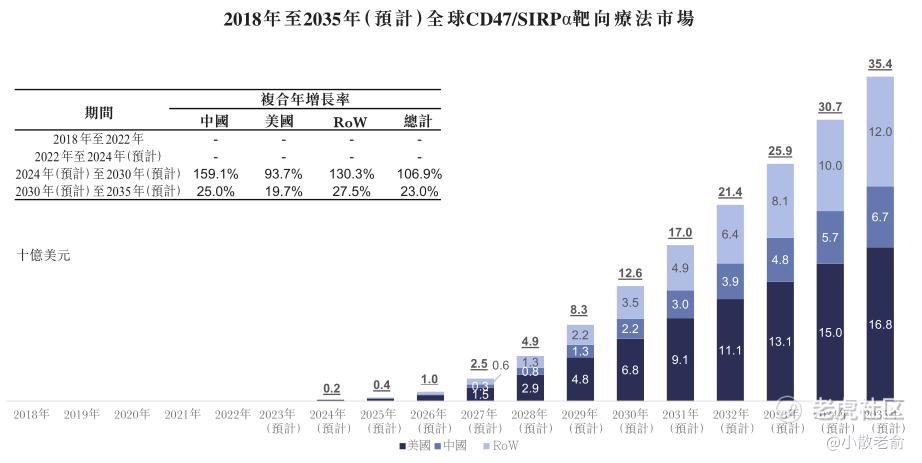 根据弗若斯特沙利文的资料,预计在2024年随着首个该类药物的上市,CD47/SIRPα靶向治疗的全球市场有望迅速扩大。这个市场预计将从2024年的2亿美元增加到2030年的126亿美元,相当于2024年至2030年间的复合年增长率为106.9%,并在2030年至2035年期间以23.0%的复合年增长率进一步增加至2035年的354亿美元。预计2030年美国CD47/SIRPα靶向治疗市场规模将达到68亿美元,2024年至2030年期间的复合年增长率为93.7%,2035年将进一步增长至168亿美元,2030年至2035年期间的复合年增长率为19.7%。