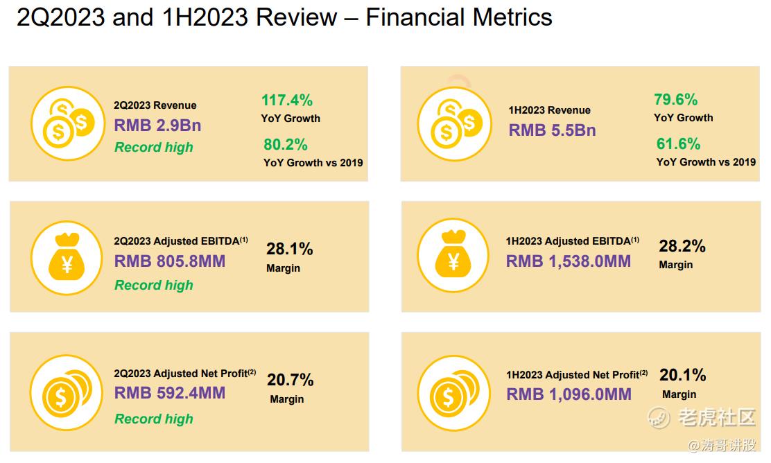 2023Q2,营收达到28.66亿元,同比增长117%;归母净利润从亏损扭转为盈利3.56亿元;经调整后的净利润为5.92亿元,同比增长429%,创下历史新高,Q2业绩超出预期。2023Q2毛利率为75.5%,同比提高了4.6个百分点,经调整后的净利率为20.7%,同比提升了12.2个百分点。居民的出行意愿正在恢复,旅游行业保持着高景气,公司的盈利能力已接近疫情前的水平。