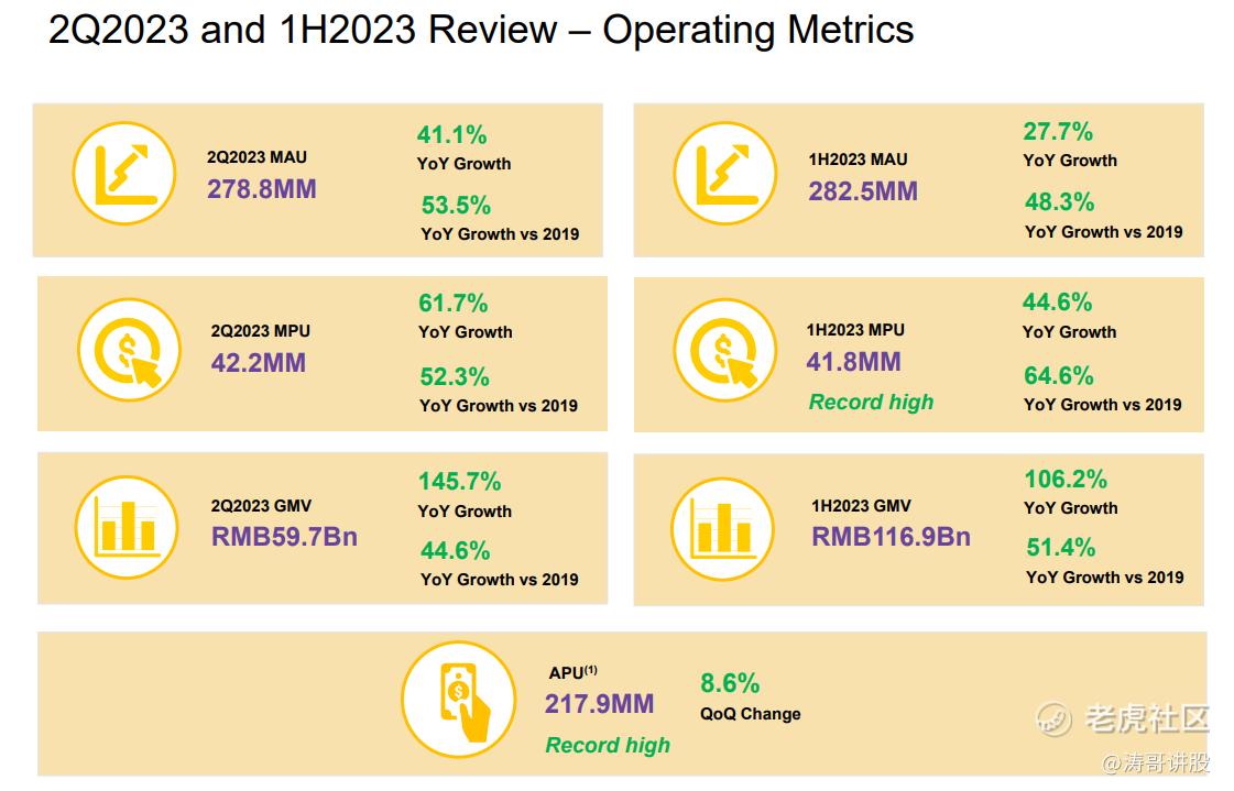 2023Q2的平均月活用户(MAU)为2.8亿人,平均月付费用户(MPU)为0.4亿人,同比增长分别为41%和62%,创历史新高。付费率达到15.1%,创下了三年来的新纪录。通过以微信为主的多元渠道获取用户流量,并深耕下沉市场,其中微信小程序贡献了MAU用户的80%,而非一线城市的注册用户占全部注册用户的87%。