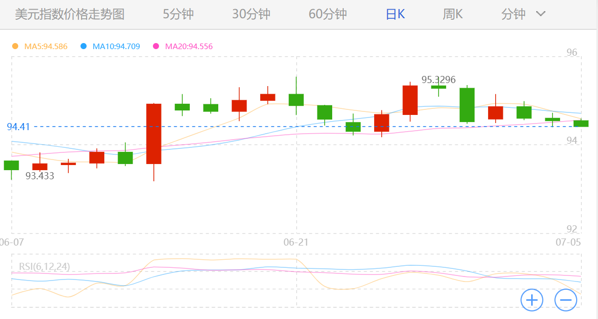 今日,美元指数亚洲市场开盘即跌0.2%,随后基本未变; 技术面上看,美元的5日、10日均线呈现死亡交叉,日高连续五日下降;市场分析称,如果美元指数今收于6月反弹走势61.8%回档位94.08下方,或能鼓舞空头。