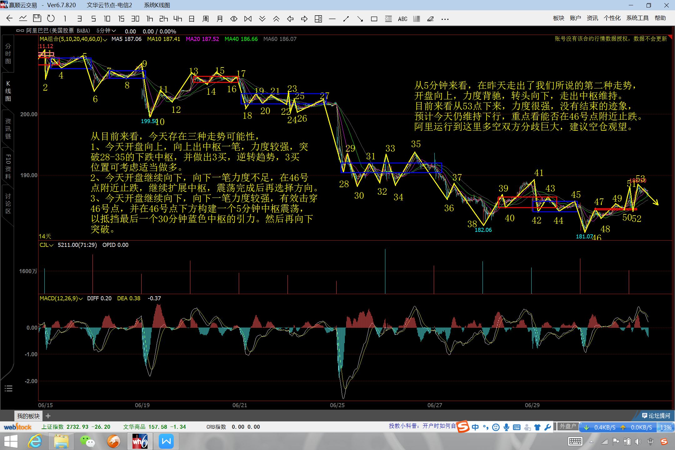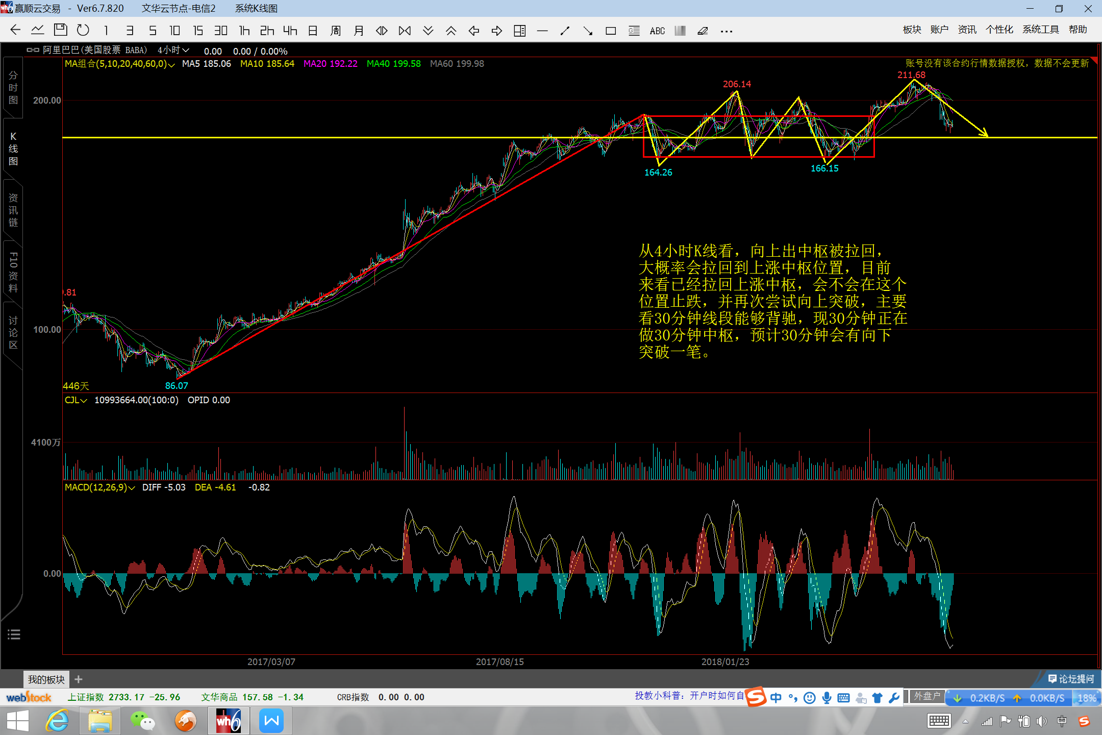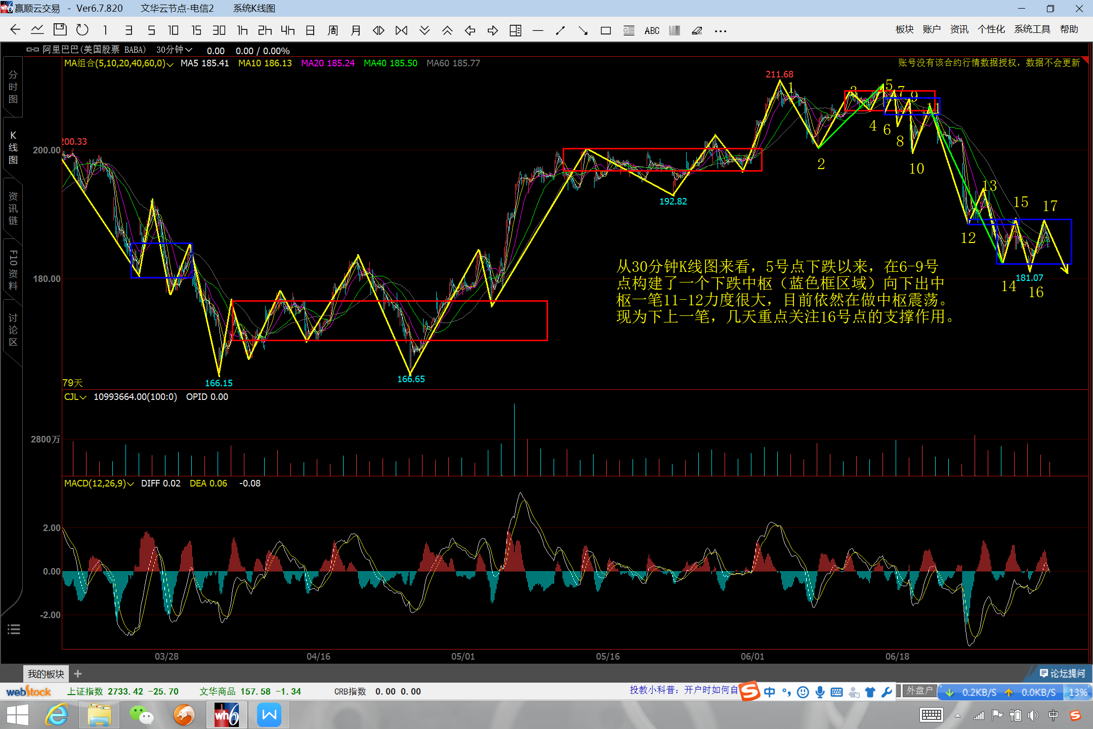 $阿里巴巴(BABA)$ 依然是中枢维持,目前来看为30分钟向下一笔,指数运行到这里建议空仓观望,少操作多看。从之前的走势看,我在这个位置是有偏向性的,我认为在这里持续震荡后,突破方向依然会向下,但向下的力度较之前力度应该回有削弱,我认为日线回拉中枢一笔已经接近尾声,随时可能结束。
