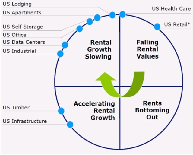 下图显示了美国各REITs领域处在的增长周期。医疗和零售正处在租金下滑周期,木材,基础设施处在租金加速增长周期。而剩下的领域,如工业,数据中心,办公室,仓储,公寓,和住宿,则处在租金增长放缓的周期: