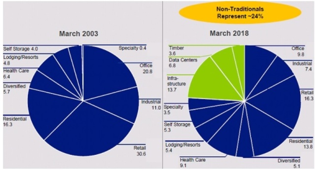 REITs的四大传统领域,零售,办公室,住宅,和工业,在FTSE NAREIT股票REIT指数中的权重,已经从2003年的79%,下降到2018年的47%: