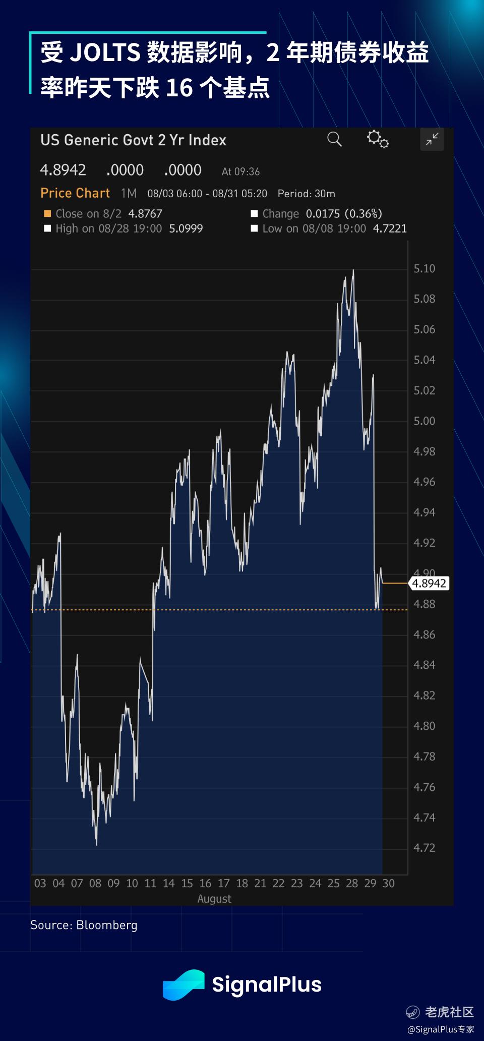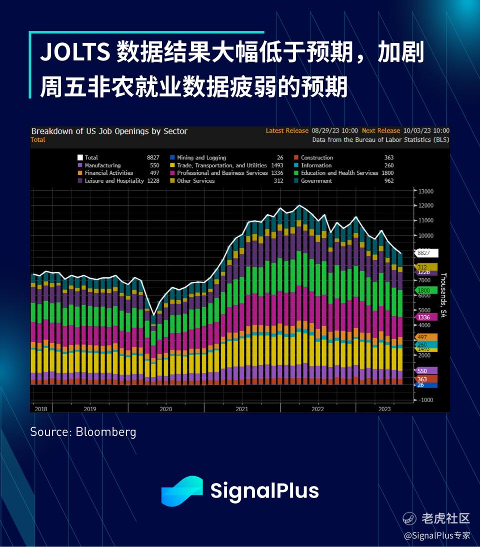 昨天,固定收益市场被迫面对现实,美国经济数据遭遇阻碍,JOLTS 就业数据和消费者信心均远低于市场预期,7 月份职位空缺数为 882.7 万,与预期的 950 万有约 4 个标准差的差距,甚至比已经下修的 6 月份数据 916.5 万更低,职位空缺的下降主要集中在专业服务领域;另外,辞职率从 2.4% 降至 2.3%,为 1 月份以来的最低水平,与疫情前的水平一致,其中住宿和餐饮服务业的降幅最大,从 5.1% 降至 3.9%;Powell 偏好的职位空缺与失业人口比率从 1.6 下降至 1.5,为 2021 年 9 月以来的最低水平,但仍远高于代表就业市场较为健康的 1.2 水平,不过其他数据已经加剧了市场对于本周五非农就业数据将走软的预期。