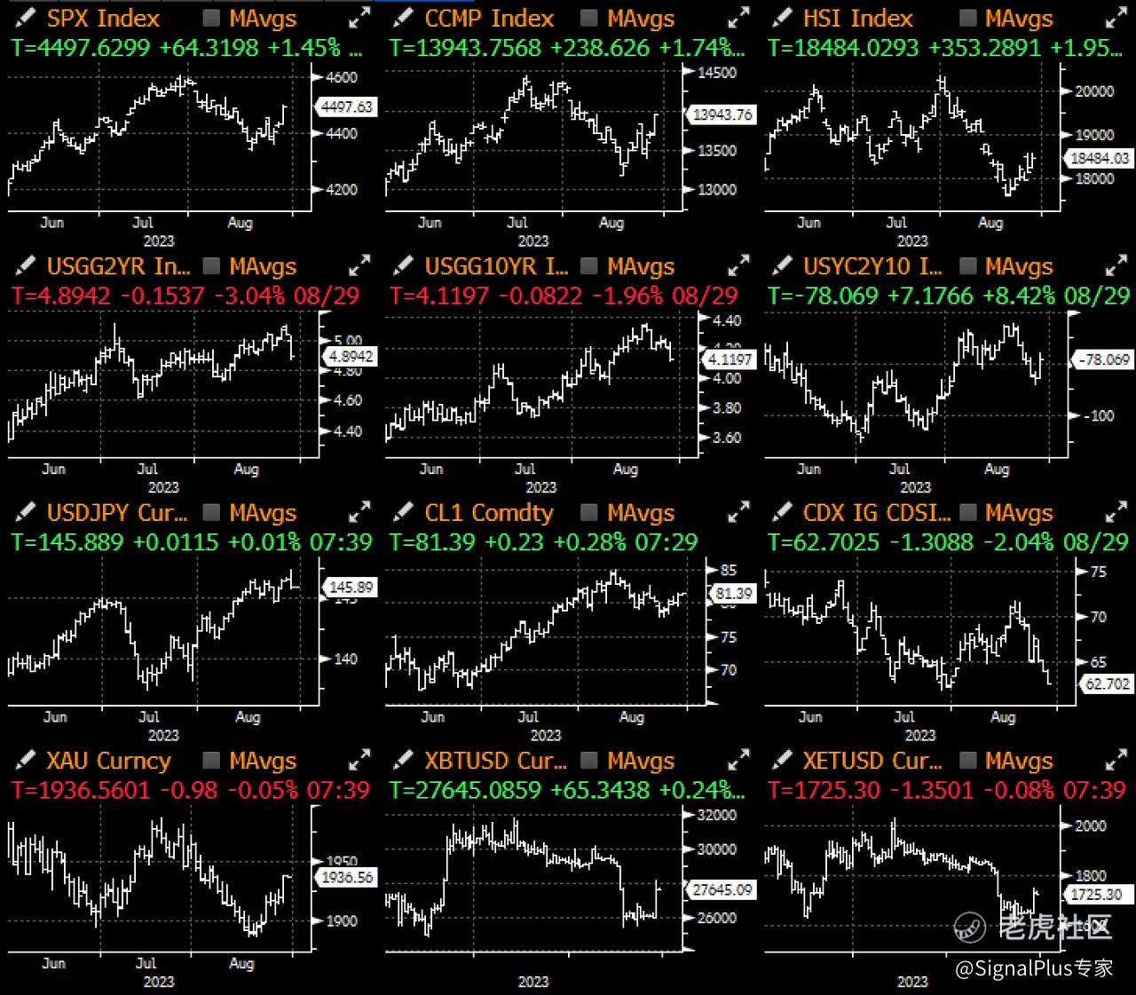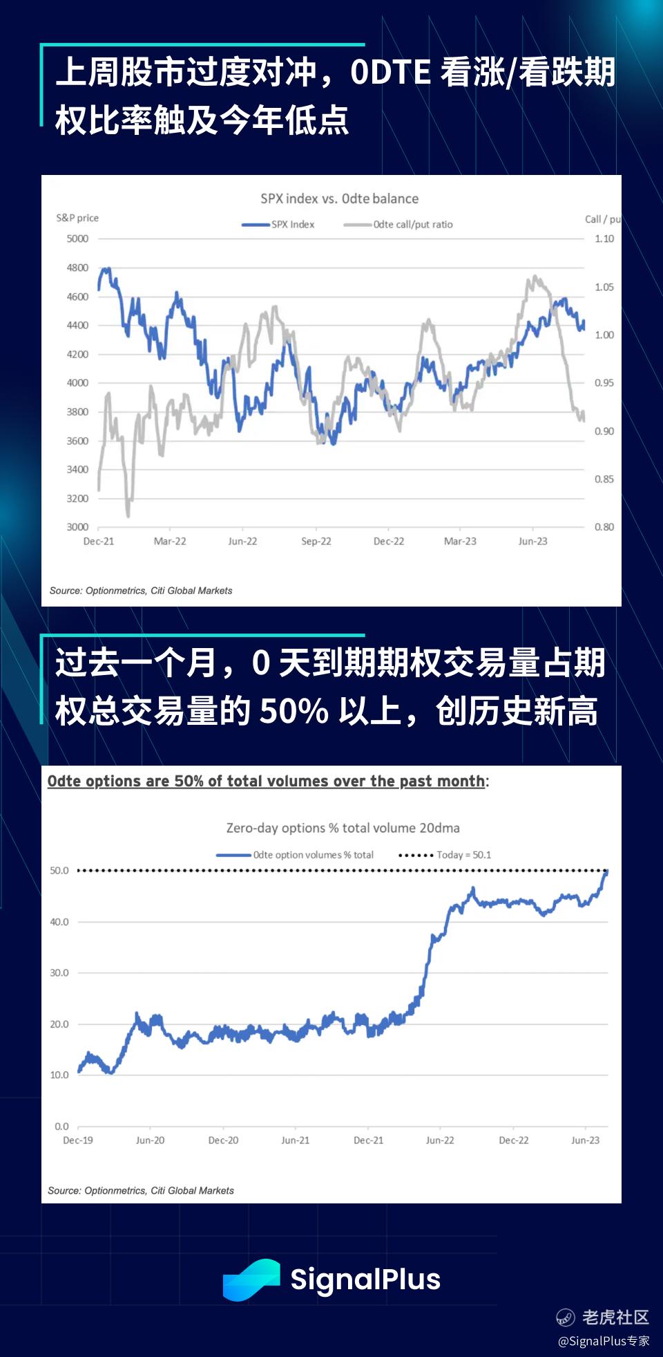 随着市场努力应对实际收益率的上升,0 天到期 (0DTE) 看涨与看跌期权比率在 8 月触及今年低点,轧空的时机已经成熟,美国主要股指上涨 1.5-2%,而“最被做空”的股票涨幅则为双倍;此外,日间交易和短期策略仍为主流,0DTE 期权交易量占过去一个月总交易量的 50%,创下历史新高,预计市场将继续在 NFP、CPI 和 9 月 FOMC 期间看到更大的日内波动,这是当前“依赖数据”叙事的标志。