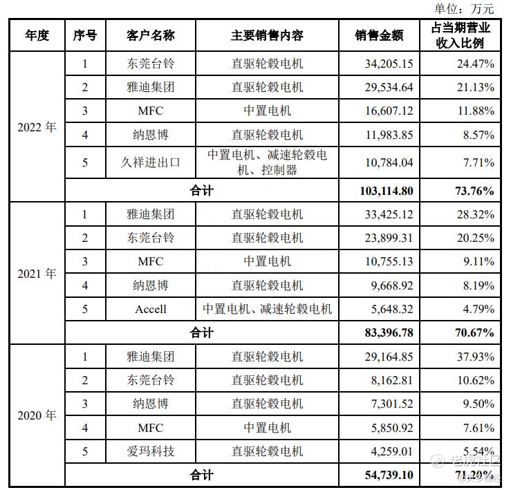 2020年、2021年和2022年,安乃达前五大客户的收入占比分别为71.20%、70.67%和73.76%。其中,雅迪集团是安乃达2020年和2021年的第一大客户,收入占比分别为37.93%和28.32%。