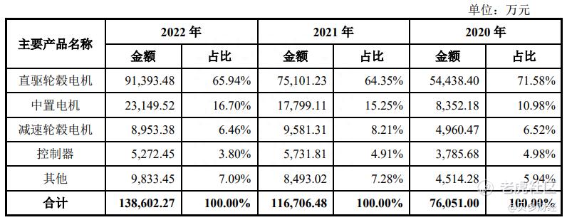 贝多财经发现,安乃达的营业收入主要由直驱轮毂电机产品贡献。报告期内,安乃达来自该项产品的收入分别为5.44亿元、7.51亿元和9.14亿元,占比分别为71.58%、64.35%和65.94%。