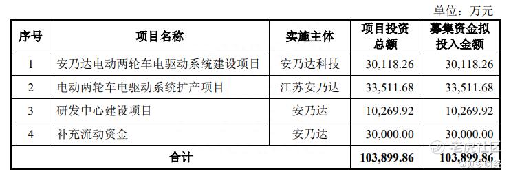 本次冲刺上市,安乃达计划募资10.39亿元,其中3.01亿元将用于安乃达电动两轮车电驱动系统建设项目,3.35亿元用于电动两轮车电驱动系统扩产项目,1.02亿元用于研发中心建设项目,另外3亿元用于补充流动资金。