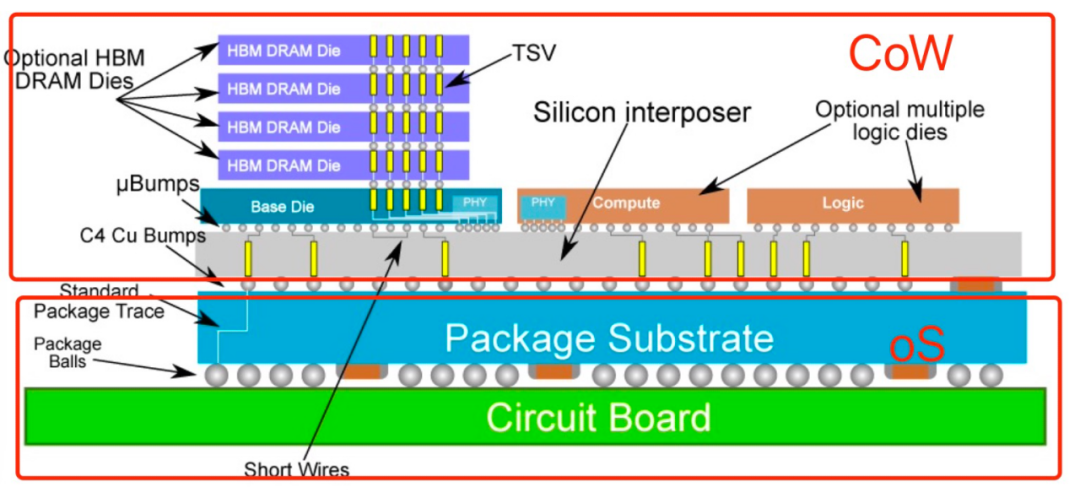 CoWoS由CoW和oS组合而来:CoW表示Chip on Wafer,指裸片在晶圆上被拼装的过程,oS表示onSubstrate,指在基板上被封装的过程。