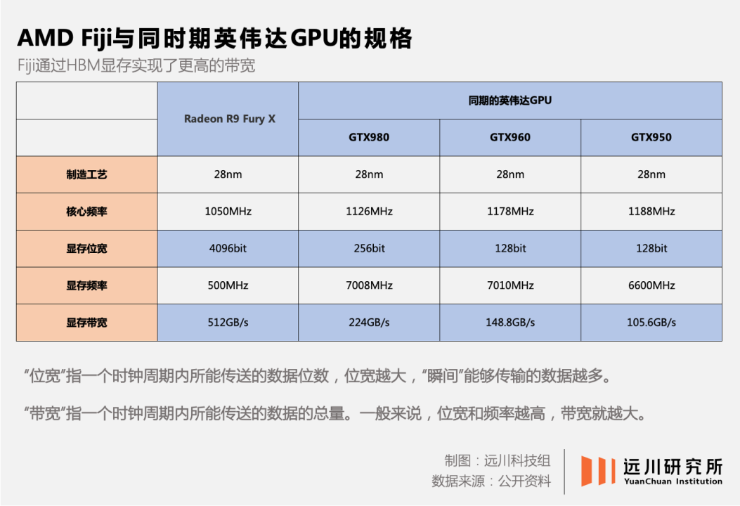在当年发布的AMD Fiji系列GPU中,AMD采用了与SK海力士联合研发的堆叠式内存,并将其命名为HBM(High Bandwidth Memory)。