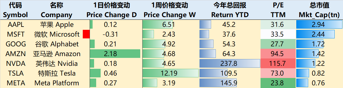 截止8月17日收盘,一周表现最强势的是 $特斯拉(TSLA)$ 的+12.19%,其次是 $苹果(AAPL)$ 的+6.51%,而 $谷歌(GOOG)$ +4.92%, $亚马逊(AMZN)$ +4.68%, $英伟达(NVDA)$ +4.65%, $Meta Platforms(META)$ +3.19%, $微软(MSFT)$ +2.43%。