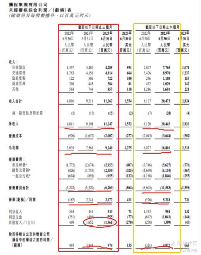 看点3:净利环比增长与收入增长失衡。23Q2,实现收入112.62亿元,同比增长180.43%,环比上升22%;归属携程集团有限公司净利润6.31亿元,同比增长814.49%,但较23Q1的34亿元大幅减少逾81%。利润报表中显示,其中其他收入/(支出)23Q2为冲减19.61亿元,而23Q1为增加16.52亿元。财报中表述为:“若不计股权报酬费用以及包含在其他收入/(支出)中的按公允价值计量且其变动计入损益的投资和可交换债券公允价值变动损益及其对所得税费用的影响,2023Q2归属携程集团股东的净利润为34亿元。”