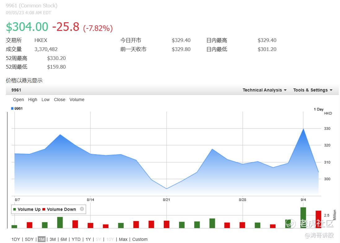 股价表现:9月5日,收盘报收于304港元/股,涨幅-7.82%,成交量337万,成交额10.49亿港元