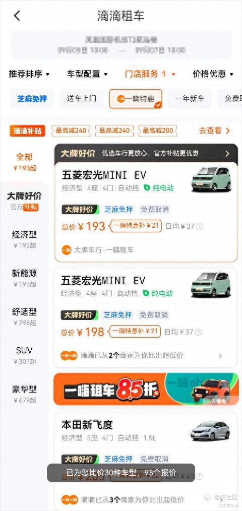 用户从滴滴租车车型列表页面点击“一嗨特惠”快捷筛选,即可租用一嗨车辆