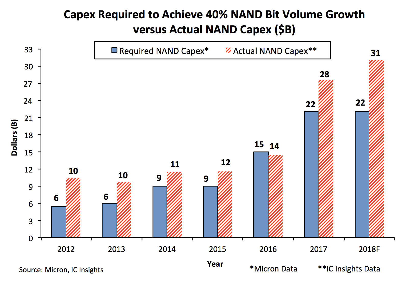 在五大NAND供应商中,绝大多数声明他们相信NAND的比特容量需求增长将会在接下来的几年中每年平均增长大约40%。图中我们可见,去年支持这一增长率的资本实际支出高于所需27%,而今年IC Insights预见实际资本支出将高出41%。结果是,NAND的价格毫无意外地在2018年初软化。此外,NAND价格将保持这个节奏于今年下半年持续缓慢走低,一直持续到明年。