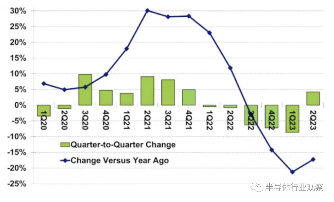 根据 WSTS 的数据,2023 年第二季度全球半导体市场环比增长 4.2%。这是 18 个月来首次连续增长。与去年同期相比,2023 年第 2 季度市场下降了 17.3%,较 2023 年第 1 季度 21.3% 的年降幅明显改善。