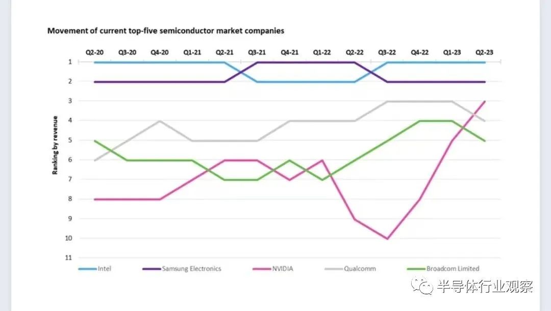 NVIDIA 引领了 2023 年第二季度的半导体扭亏为盈。从整个行业来看,半导体收入比上一季度增长了 46 亿美元,其中 25 亿美元的季度收入增长仅来自 NVIDIA。NVIDIA 主导的生成式 AI 市场近期需求快速增长,正在推动 NVIDIA 的市场份额排名不断上升。