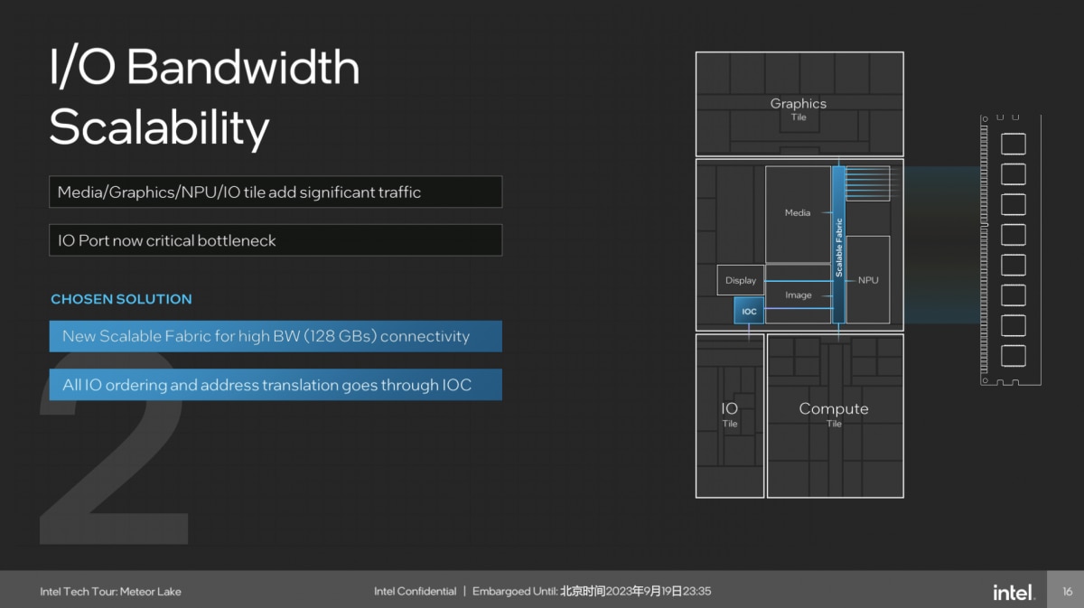 “碰到带宽问题,常规解决办法是制定优先级,为一些IP创建高优先级。过去我们就是这么做的。但现在由于新IP的引入和划分,Meteor Lake不能再沿用老的设计方式。”“所以我们针对SoC做了全新的带宽扩展,适配SoC内部所有IP对带宽的需求,消除SoC中IP与IP、IP与总线、IO之间的通信瓶颈。”