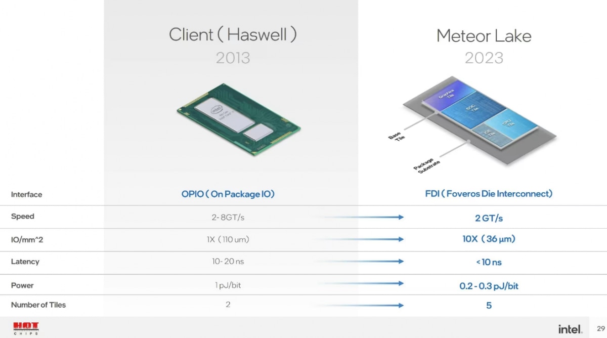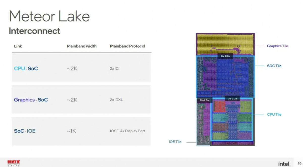 去年Hot Chips 34期间,我们就Meteor Lake的chiplet设计做过了比较详细的解读——就先进封装层面的详细信息,包括die间通信功耗、协议、带宽等,推荐阅读这篇文章。