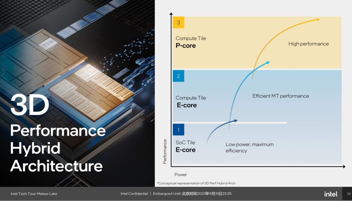 截至发稿前,暂不清楚这两颗单独的E-core在架构层面,是否与Compute tile上的E-core一致。猜测应该是不同的,因为在介绍调度策略时,Intel给出这种类似三丛集架构(Intel称其为3D性能混合架构)的功耗与性能关系,大致如下图: