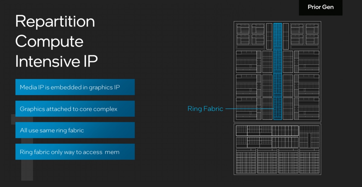 我们一个个来看。首先是“计算密集型IP重新划分”——大致上体现在几个方面,过去monolithic时代的酷睿处理器设计,媒体编解码器是和核显(graphic IP)是放在一起的;而核显则挂在LLC(L3 cache)上——前文也提到了这一点。下面这张图展示了ring fabric将这些IP串起来。
