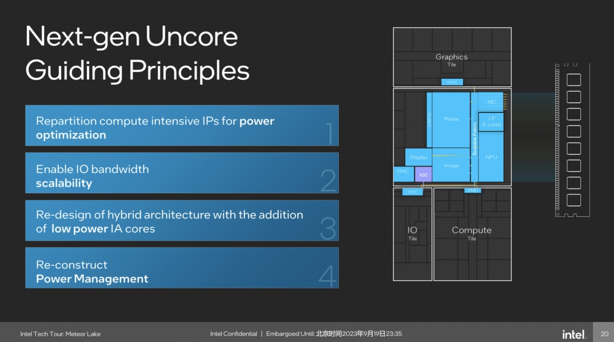 有关SoC tile,及其中相关uncore的部分,在于践行低功耗、高能效理念过程里,这部分存在的价值。Intel花了不少篇幅去谈uncore的设计指导原则——也可能成为未来酷睿处理器设计的基础:包括第一,对计算密集型IP的重新划分,实现功耗优化;第二,IO带宽可扩展;第三,引入低功耗核心(即LP E-core);第四,重组电源管理设计。