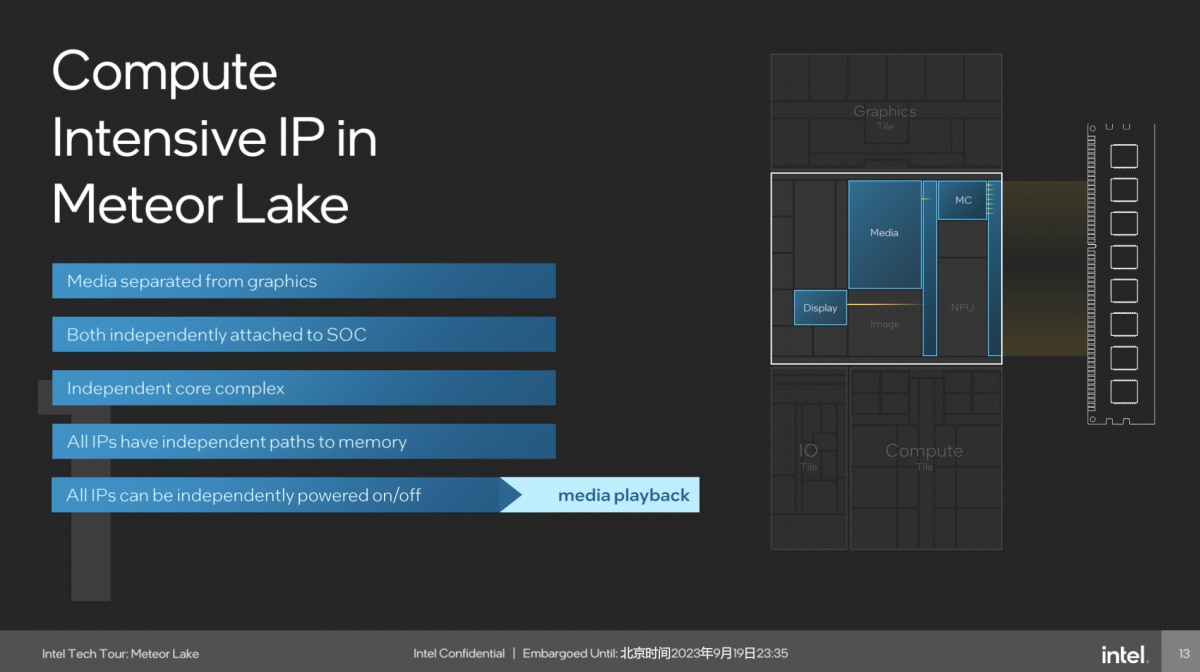 比如说只是流媒体播放的话,media IP对memory做访问,就要把整个ring都开启。那么为了解决这个问题,前文已经提到Meteor Lake的核显部分是单独位于Graphics tile的;媒体引擎则位于SoC tile;CPU核心主要位于Compute tile。也包括内存控制器,“它们都有自己独立的、在SoC总线上面attach的位置。”如下图。
