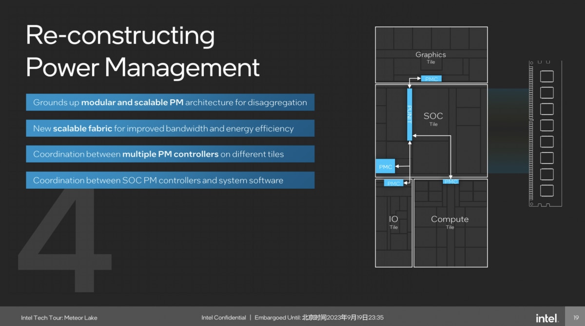 这又是个模块化、可缩放的方案,也是去中心化的组成部分。Intel说这种新架构“为Meteor Lake提供了很多电源管理方面新的功能,也为将来芯片设计的电源管理,奠定了非常好的基础”。怪不得Chips and Cheese认为Intel的chiplet方案相比AMD的更松散、更灵活。