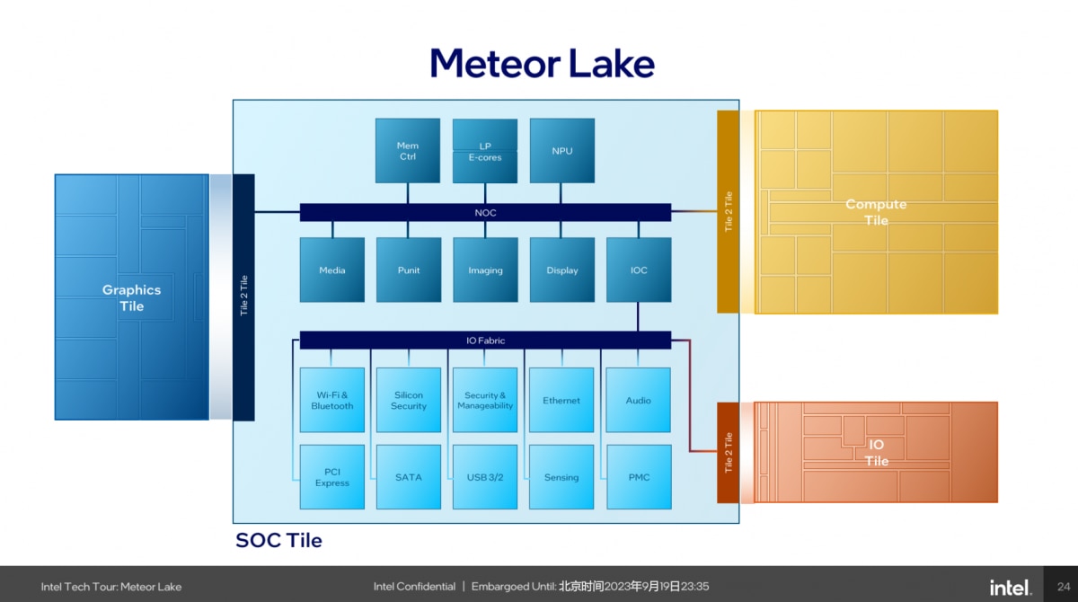 从这次Intel的介绍来看,Meteor Lake依旧分成了Compute tile(上面主要是CPU)、Graphics tile(核显)、SoC tile(其上包含有一个低功耗E-core,NPU,WiFi与蓝牙模块、显示引擎、DDR内存控制器等)、IO tile(主要是PCIe Gen 5与Thunderbolt 4支持实现)。Intel称其为“tile”,中文译作“模块”,实际上就是chiplet。