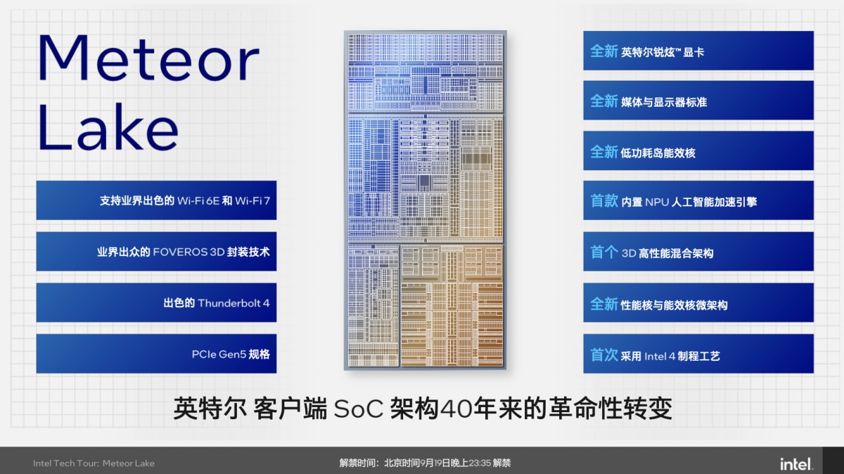 Intel在介绍中提到,Meteor Lake的核心设计理念包括(1)性能功耗效率提升;(2)首次将NPU集成到PC处理器;(3)集显性能飞跃;(4)采用Intel 4制造工艺。