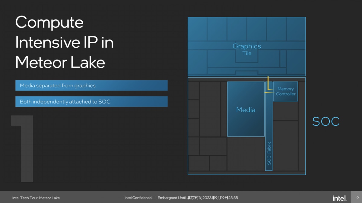 就不同tile的定位,Intel在宣传中对Graphics tile的描述是“为3D性能做优化”,对Compute tile的描述则为“为CPU性能做优化”——这两样都很好理解。而SoC tile描述为“为功耗做优化”。
