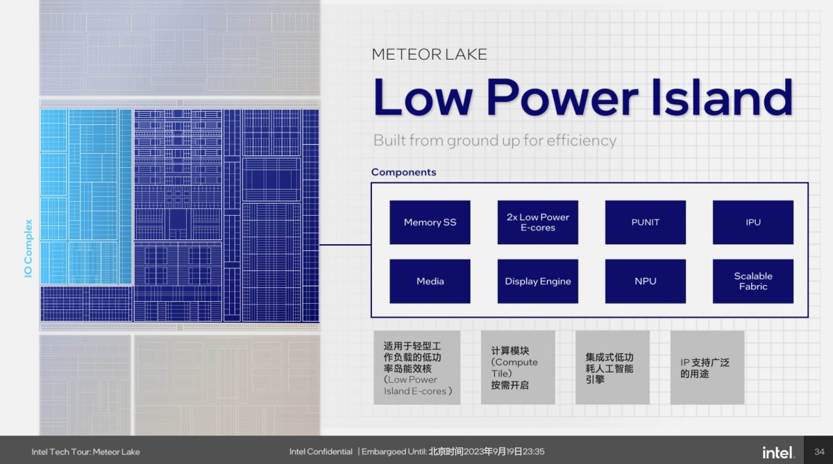 LP E-core所在的SoC tile(或其中一部分)似乎是被Intel称作为“Low Power Island”(低功耗岛)的,也不光是因为两颗LP E-core,还在于其他模块——这个我们放到后文去谈。