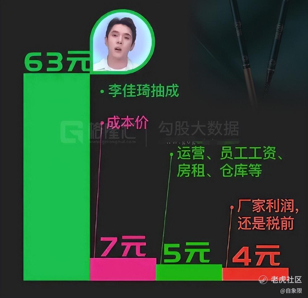 该图片显示,一只售价79元的花西子眉笔(直播时包含两支替换芯,不知道该成本核算是否包含),厂家税前利润4元;运营、仓库、房租、员工工资等成本5元;原材料等成本7元。但李佳琦抽成却高达63元,占比79.74%。