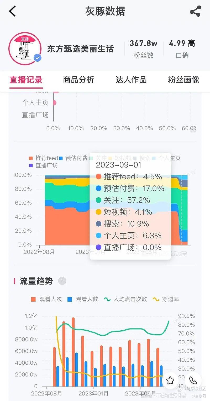 而另一方方面,也有网友通过第三方平台的数据发现,抖音账号东方甄选的直播数据从9月份开始呈现出断崖式下跌。在这之前,东方甄选旗下自营产品账号也曾被短暂关停。