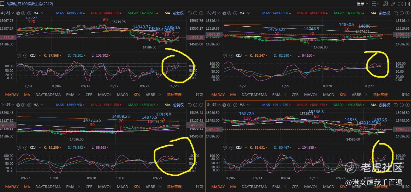 而从更大一点的周期看(纳指周线),周线5和10下周没法金叉,并且都会向下,那就是说纳指后市向上的压力还是大的,所以我个人还是比较希望纳指能强势一点突破10天线站稳,否则再次打下来的话,14580这个位置个人觉得不一定能支撑得住。正如昨晚复盘说的,谨慎保守一点的投资者要防纳指破位14580后打下去的空间。