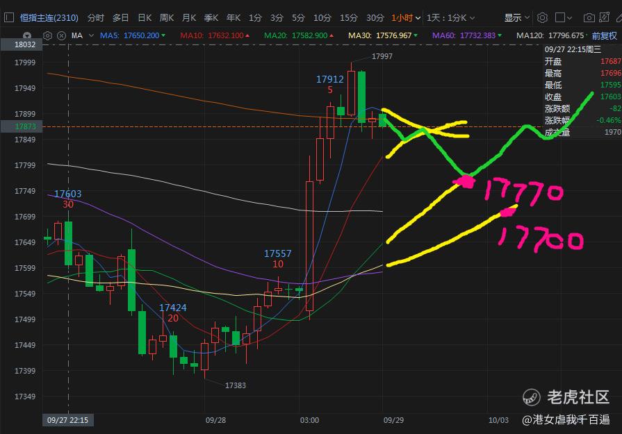 昨晚恒指反弹回到17530上方后一直横盘,今天早上开盘直接爆拉,外资趁着北水不在疯狂扫货,看来拉港股不需要什么利好消息,大A休市就是最大利好,原来之前一直是北水砸盘啊,内奸实锤了。。。。。。不过这种什么长假爆拉等北水回来接盘的说法,无法证伪,也就当玩笑吃个瓜吧。从技术面来说,恒指今天这根大阳连续突破5天和10天两条均线,直到碰20天线的压力18000后有小回落,那么与上上周五的大阳线同样道理,现在恒指这个位置,没有条件连续上涨,必定会有回调,那么就要考验回调的深度(上周五我也说过这句话,结果隔天来个大阴线)。但短时间内两根大阳,那么我们对恒指近期能够出底的预期就会强了很多。