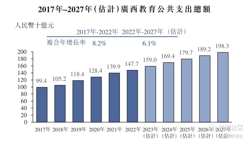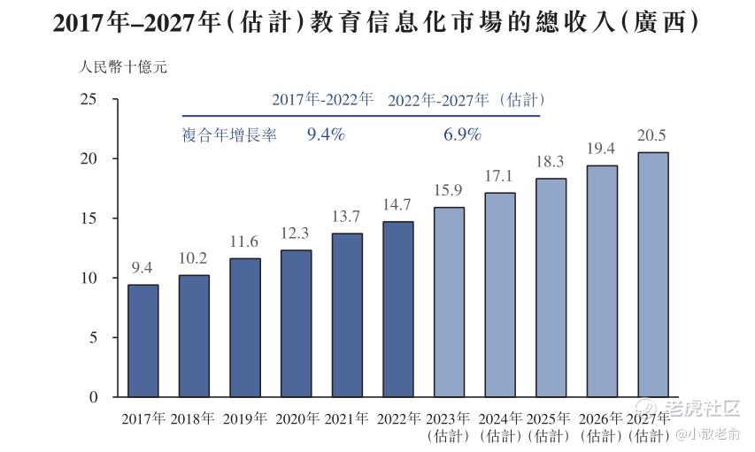 在政府的大力支持及IT教育公共支出增加的情况下,广西教育信息化市场的总收入有望在未来五年内保持增长,到2027年将达到人民币205亿元,2022年至2027年的复合年增长率达6.9%。