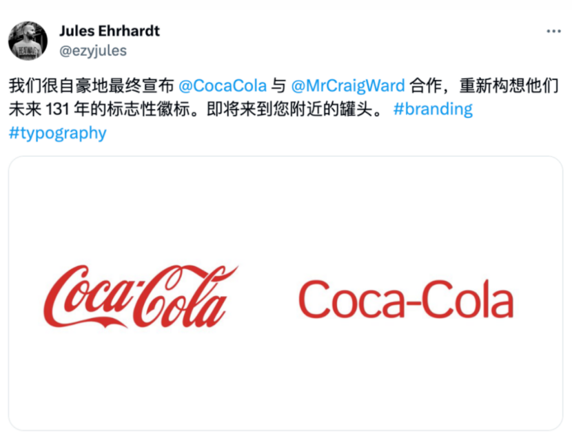 近日,设计师Jules Ehrhardt在X上发布:“很自豪地宣布我们的新作品,我与 Craig Ward 先生合作,重新构想了可口可乐标志性的 LOGO,为接下来的131年做准备。它很快就会出现在您手里的可乐罐上面。”而Logo在设计上呈极简化风格,简简单单的无衬线体设计,毫无品牌特色和个性。实际上,这是一则嘲讽帖,用来讽刺现代品牌极简主义标志,并非可口可乐换了新Logo。