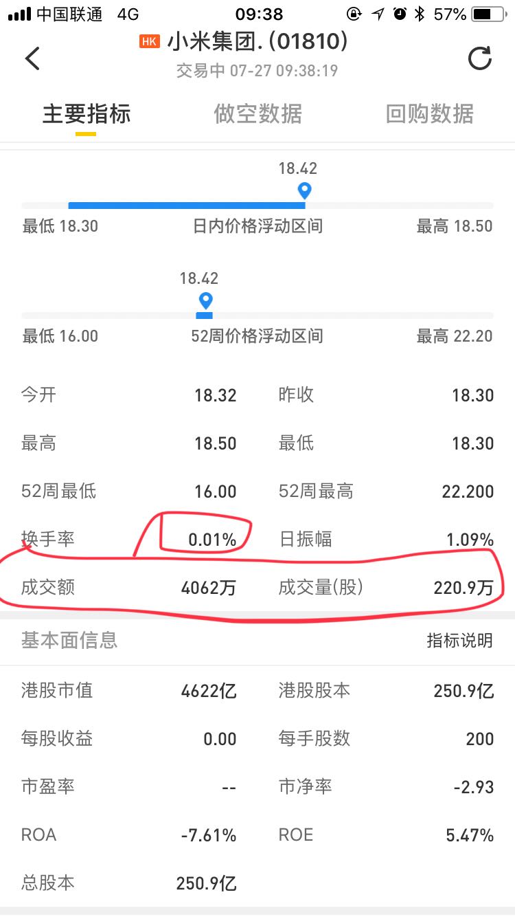 啥都不懂在那瞎指挥,那个换手率数据严重失真,真实的换手率是交易量/流通股,而老虎显示的是交易量/总股本。小米真实的换手率远高于0.01%。