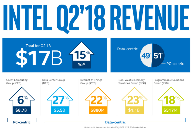 对于英特尔的最新财报,英特尔临时CEO兼CFO Bob Swan表示:“经过五十年的技术发展,英特尔的业绩有望连续第三年创下历史新高。我们具有独特的优势,可以充分利用处理、存储和移动数据的市场需求,而数据从未像现在这样普及或有价值。英特尔目前正在争夺规模达2600亿美元的市场机会,第二季度业绩表明我们正在取得胜利。由于我们各项业务都表现出持续的强势势头,所以我们上调了全年营收和利润预期。”