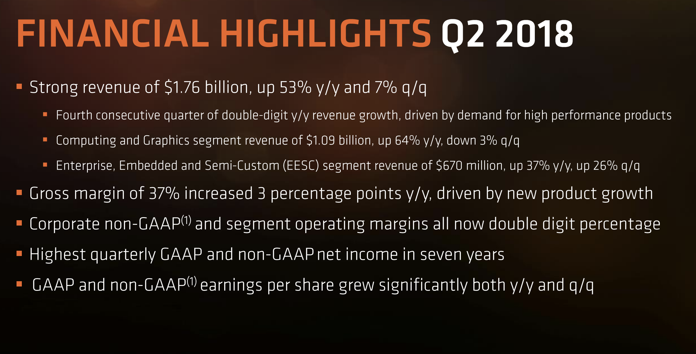 反观英特尔在CPU市场的最大竞争对手AMD的最新财报,按照GAAP准则计算,AMD第二季度营收为17.6亿美元,较上年同期的11.5亿美元增长53%,环比增长7%;净利润为1.16亿美元,上年同期净亏损4200万美元,环比增幅43%。