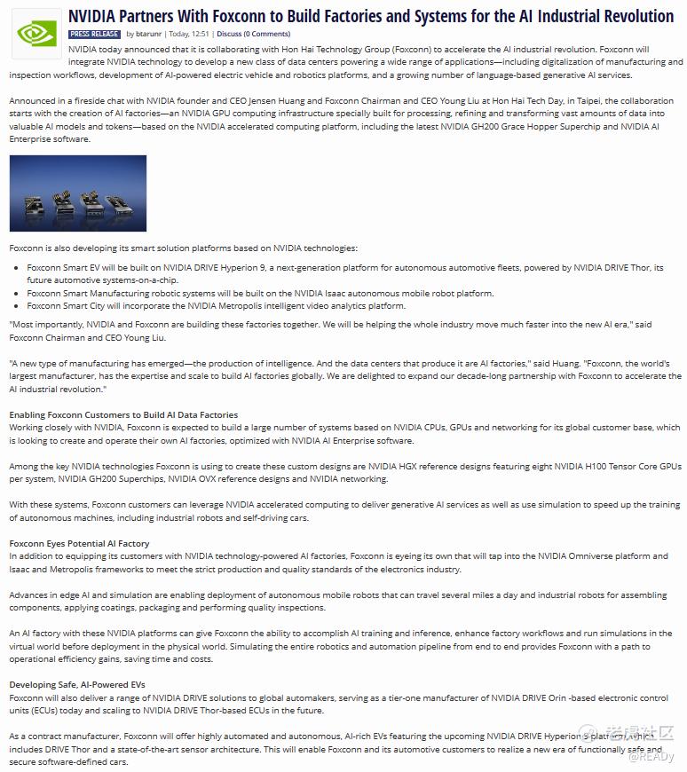 10月18日,在台北举行的富士康年度科技展上,富士康董事长刘扬伟和英伟达首席执行官黄仁勋共同登台表示,他们的公司正在共同建设“人工智能工厂”。富士康将使用英伟达(NVDA.US)的芯片和软件,为包括自动驾驶汽车在内的一系列应用建设一种新型数据中心。